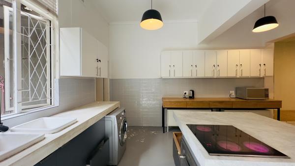 Kitchen appliances include: 4-plate stove with oven, fridge, washing machine, microwave, kettle etc.