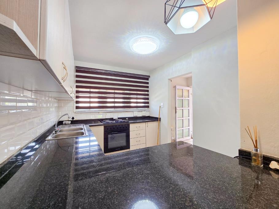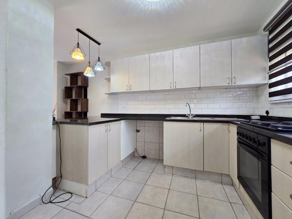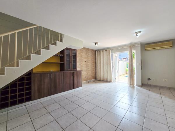 Upstairs offers two bedrooms, with the main bedroom enjoying an en-suite bathroom. A family bathroom is fitted with a bathtub, basin, and toilet. The apartment is fully tiled and air-conditioned throughout and includes two parking bays. Water is included and lights are prepaid.