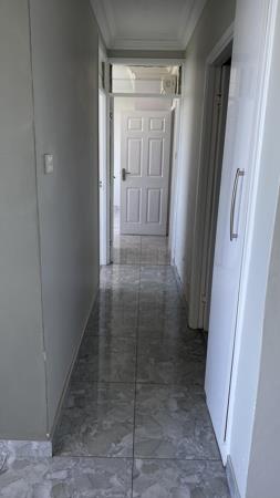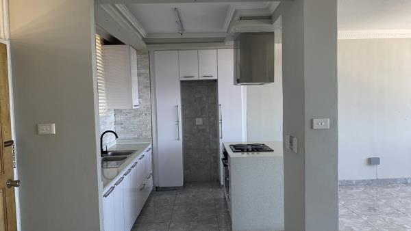 The open plan kitchen features ample cupboard space, perfect for convenient and organized living. Both bedrooms are generously sized and fitted with built-in cupboards. The main bedroom includes an en suite bathroom with a shower, while the second bathroom also offers a shower and is fitted with washing machine connections.