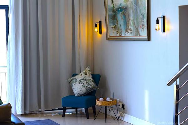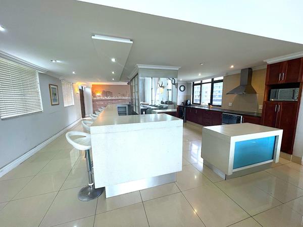 It has a superb entrance hall cum TV lounge and is equipped with a trendy 4 meter entertainers dream, built in bar. The apartment offers is an open plan, fully equipped granite topped gourmet kitchen, which opens onto the double volume lounge and dining room, complete with high-beamed ceilings.