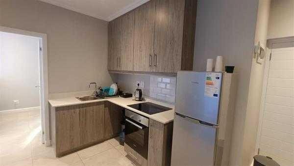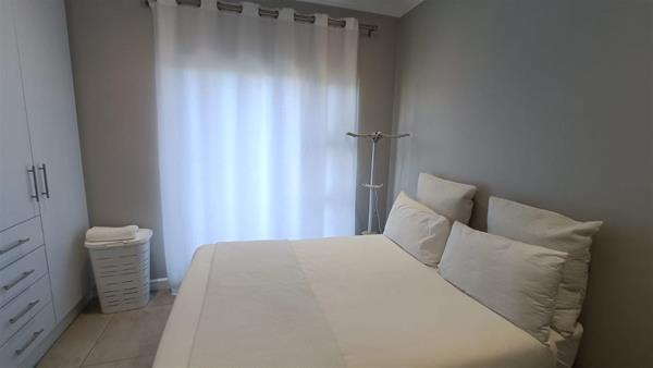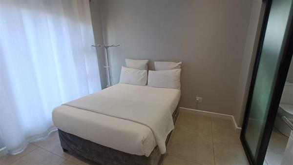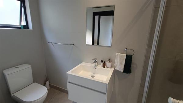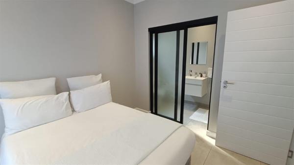 The spacious bedroom features built-in cupboards and is complemented by a modern en-suite bathroom fitted with a shower, toilet, and basin.
