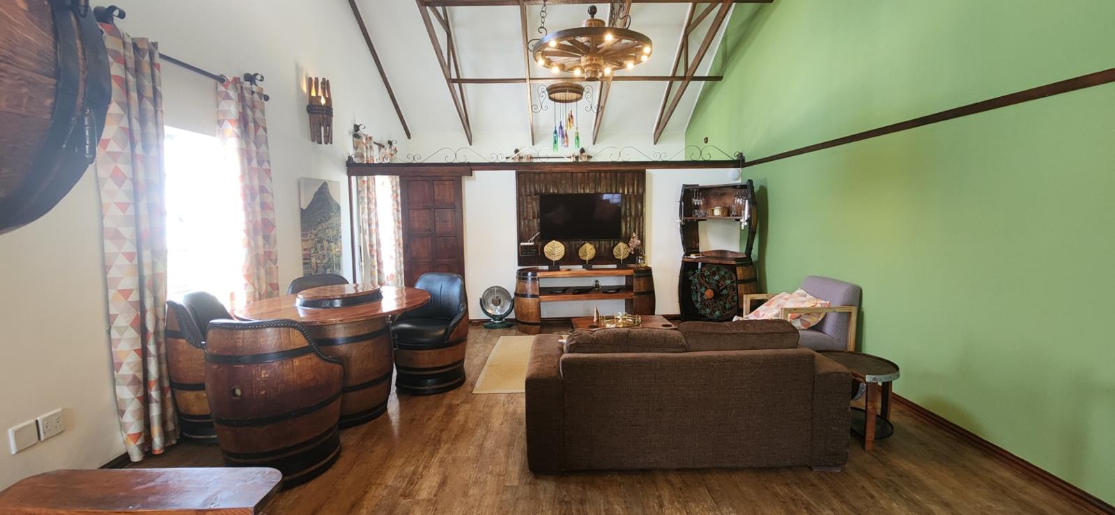Spacious open plan lounge dining room. The clever wine barrel dining room, with padded chairs and the wine barrel wine rack and display cabinets. Large Sofa and ingenious coffee table in the lounge.