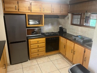 Kitchen with built-in cupboards,microwave,,oven and, stove