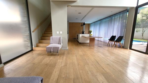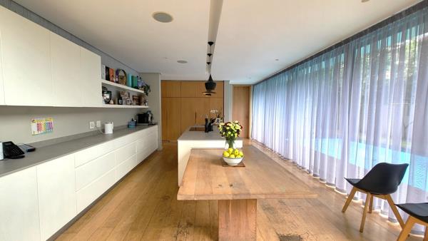 The interior of the home is sleek and inviting, features include, open floor concept, wooden flooring and walls facing the pool and entertainment area are glass panels fitted offering a clear view of one half of the property.