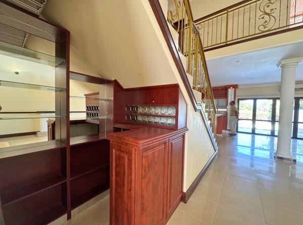 The ground floor offers expansive living spaces including two lounges, a dedicated bar area, guest toilet, dining area, and a fully fitted modern kitchen with a separate scullery. The open-plan design flows seamlessly onto a covered entertainment patio overlooking the sparkling swimming pool ideal for family gatherings or weekend relaxation.