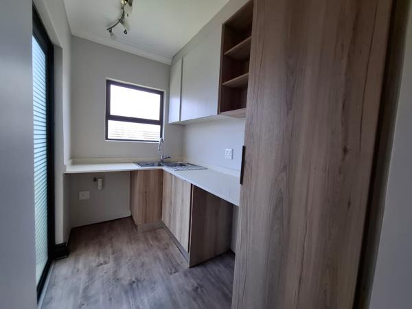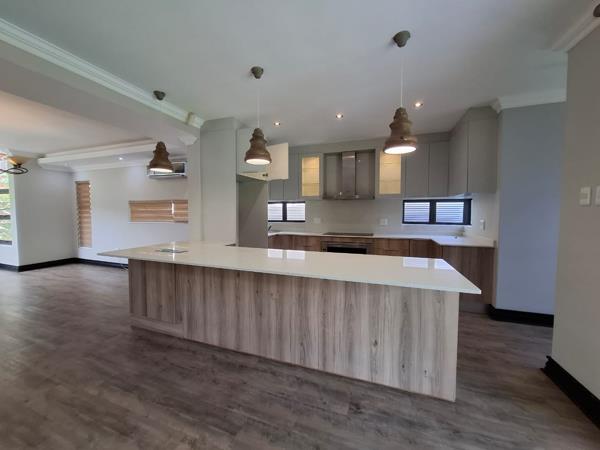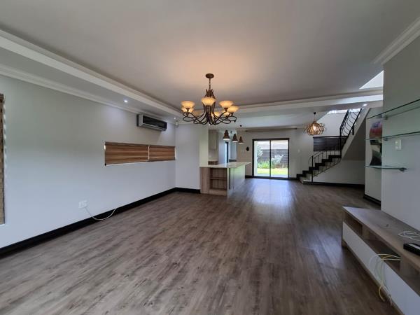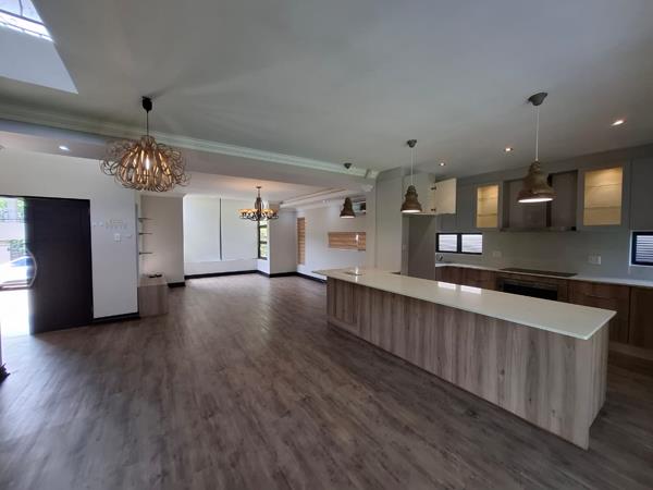 Featuring stunning open plan living areas with laminated flooring, warm lighting and a modern kitchen with scullery and an aircon. The dining area is spacious enough to accommodate a large dining set and it leads out onto a lovely private wrap around garden and covered patio.