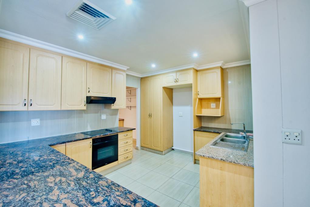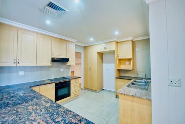 All three bedrooms are well-sized with built-in cupboards, while the main bedroom includes a modern en-suite bathroom and access to the balcony. The kitchen offers ample cupboard space, granite countertops and room for essential appliances. With a double automated garage providing secure parking, the apartment ensures both comfort and convenience.