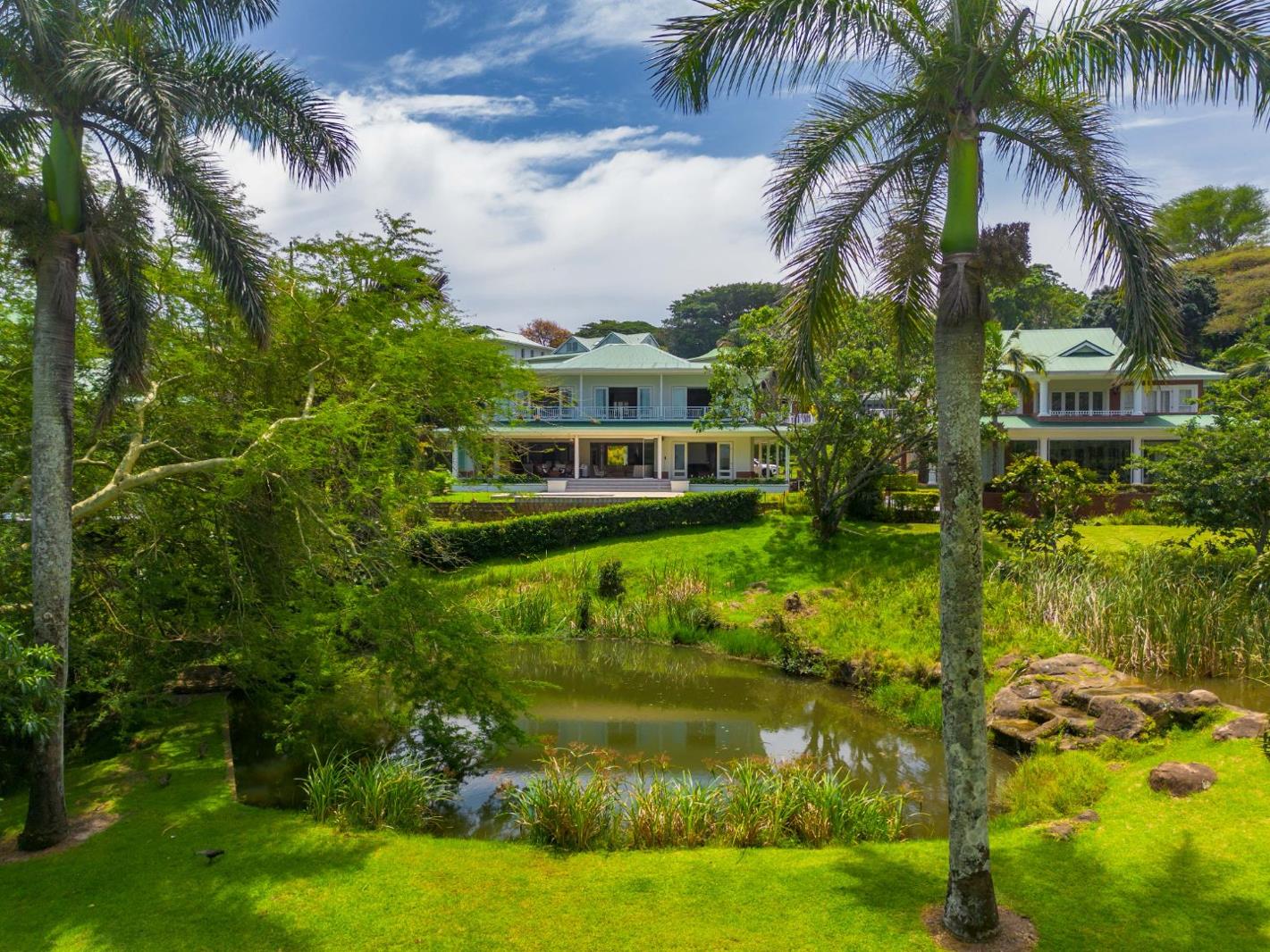 Swimming pool overlooking the landscaped garden, water feature and fairway