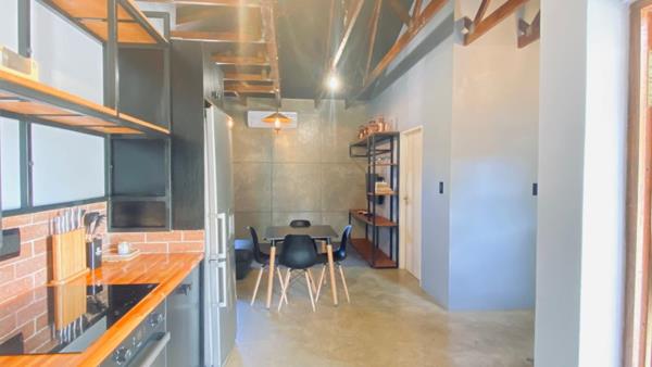 The open-plan kitchen seamlessly integrates with the dining and lounge area, creating an inviting atmosphere. The soaring high ceilings, adorned