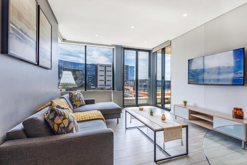 The kitchen, lounge, and dining area flow effortlessly onto a balcony with stunning views of the iconic arch, sea, and vibrant Legacy Yard. Key features include two spacious bedrooms, each with en-suite bathrooms, a powder room for added convenience, and a balcony offering breathtaking views.