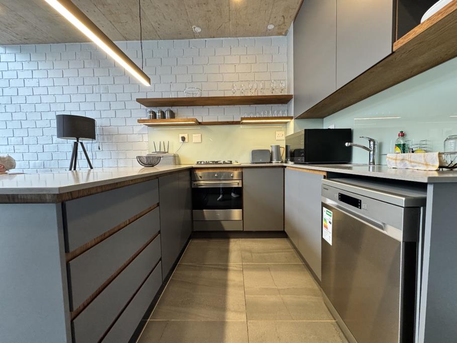 Apartment features a fully fitted modern kitchen with Smeg gas appliances and open plan lounge.