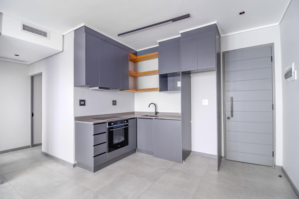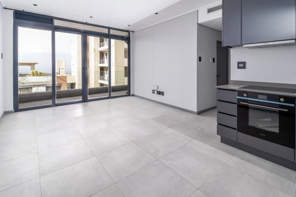 Lovely, modern open plan kitchen with sleek finishes and breakfast nook, flowing into the living area and out to a lovely sized balcony overlooking East Row and Marinna Bay apartments.