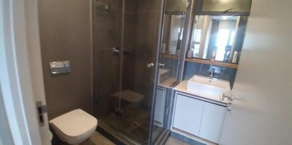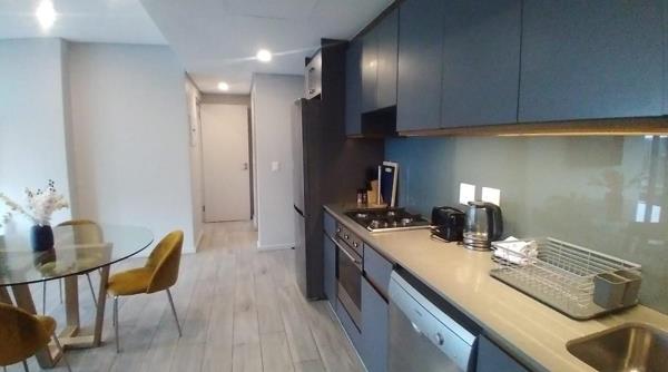 The well-equipped kitchen is designed for easy living and seamlessly integrates with the open-plan layout. The spacious lounge provides views of the vibrant Legacy Yard and partial ocean views, offering a tranquil space to unwind after a long day. Both bedrooms are ensuite, with one leading to the balcony through sliding glass doors. A guest toilet adds extra convenience to this beautifully designed home.