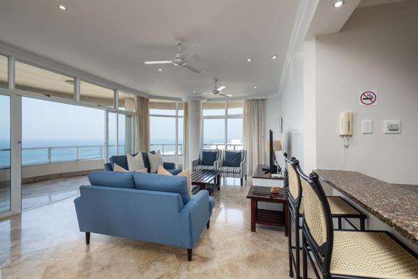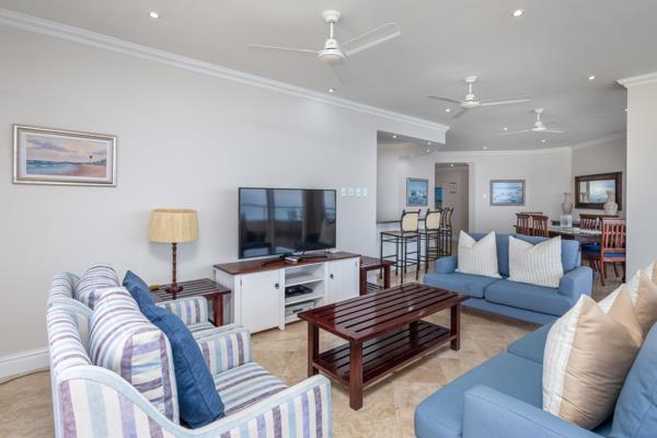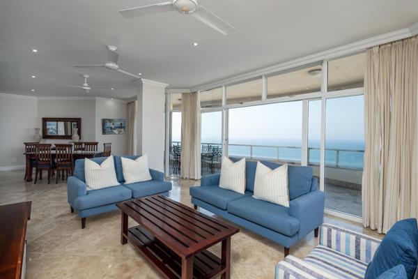 The open plan living room / dining area is comfortably appointed. The modern furnishings lends itself to a comfortable time there. One can enjoy enjoying your morning coffee or evening cocktails, with breathtaking sea views, on the balcony which leads off the lounge and all 3 bedrooms