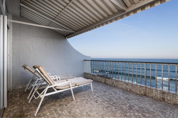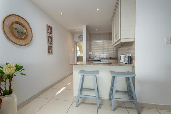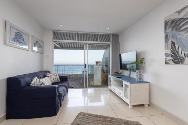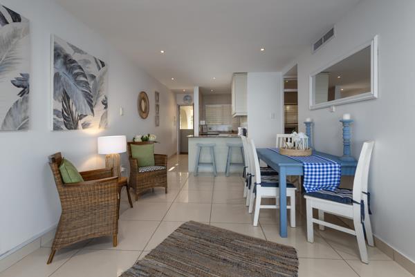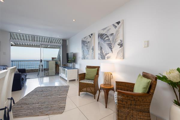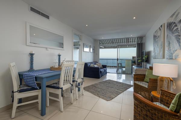 The kitchen is fully equipped for self-catering with a fridge-freezer, stove and oven, microwave, a dishwasher, and a breakfast bar with stools. The dining area contains a 4-seater dining table and chairs. The lounge area contains a flat-screen TV with DStv channels. The lounge has sliding doors opening to a large balcony with sun loungers and full sea views. A single garage is provided.