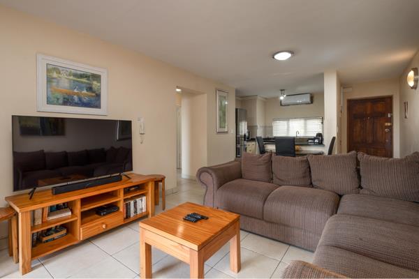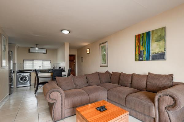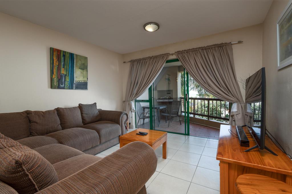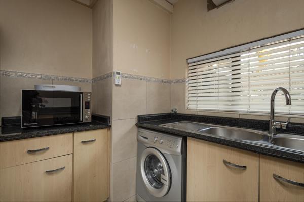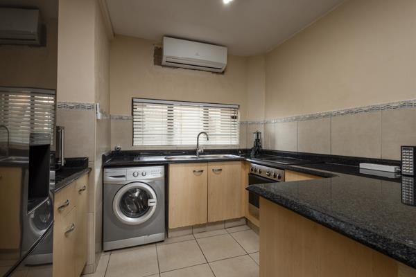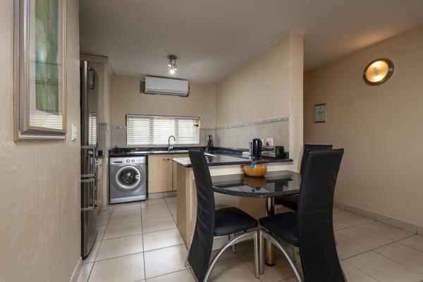 The apartment is air-conditioned. The kitchen is fully equipped for self-catering and includes a stove and oven, a fridge-freezer, microwave, a washing machine, and other small appliances. The lounge area contains a flat-screen TV with selected DStv channels.