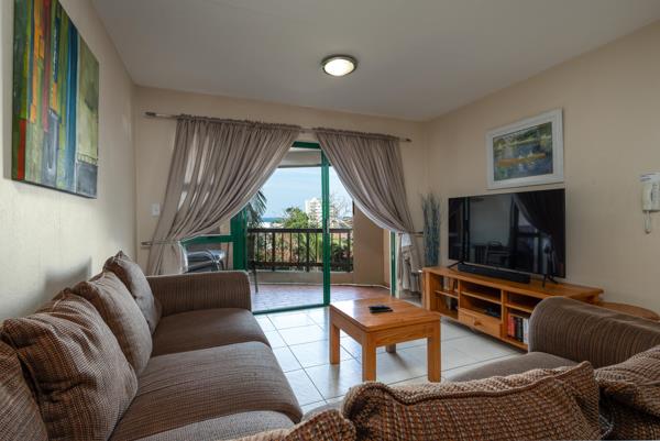 The lounge opens to a small balcony with partial sea views and patio furniture. Secure undercover parking is available.
