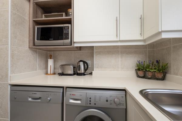 The open-plan living space features a dining area and a lounge furnished with a comfortable sofa and a smart TV. The kitchen is fully equipped with a fridge-freezer, stove, oven, microwave, and washing machine and dishwasher. All crockery and cutlery are provided.