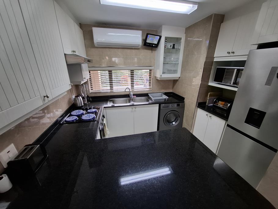 The kitchen and living area are air-conditioned. The kitchen is fully equipped for self-catering and includes a stove and oven, a fridge-freezer, microwave, and other small appliances. The lounge area contains a flat-screen TV with premium DStv channels.