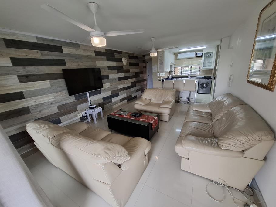 The lounge opens to a small balcony with partial sea views, patio furniture. Secure undercover parking is available.