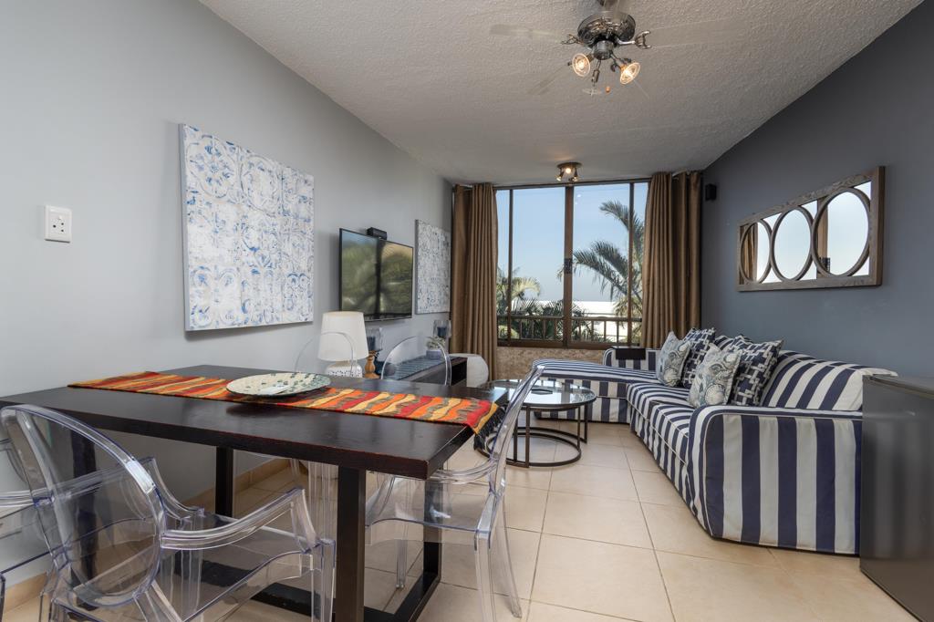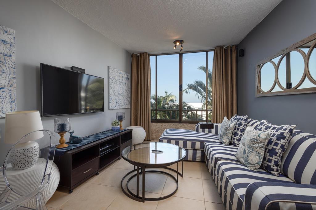 This self catering apartment is located at the popular The Breakers resort in Umhlanga Rocks on Lagoon drive.Situated on the fourth floor this is a two bedroom (1 x king and 2 x 3/4 beds), one bathroom unit. This apartment has views overlooking the front block with slight sea views. The living area consists of an open plan lounge,dining and kitchen area. The kitchen is equipped with fridge/freezer, microwave, oven, crockery and cutlery. The unit has air-conditioning. Quality bed linen and bath towels are provided however beach towels are not. The access to the unit is down a ramp or stairs to the third floor and up via lift.