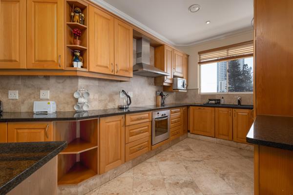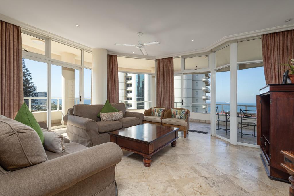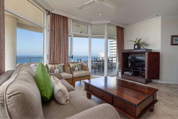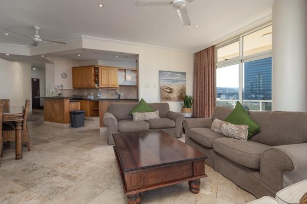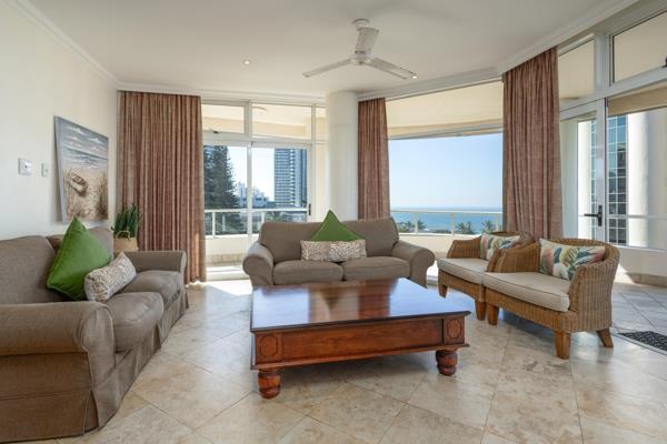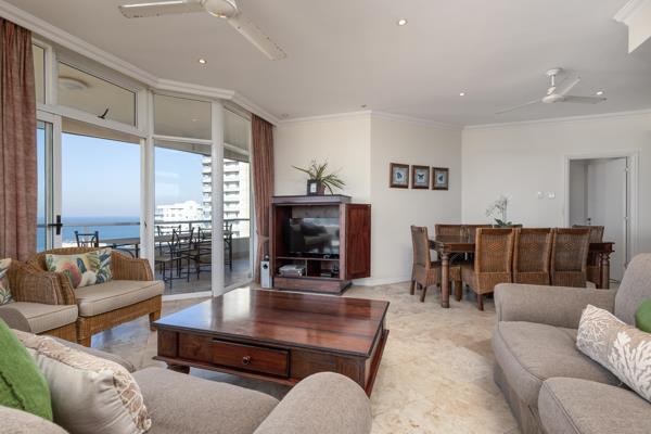The lounge has doors opening to a large covered balcony with outdoor dining furniture, and lovely sea views, overlooking the gardens and the Oyster Box Hotel. Secure undercover parking is provided.