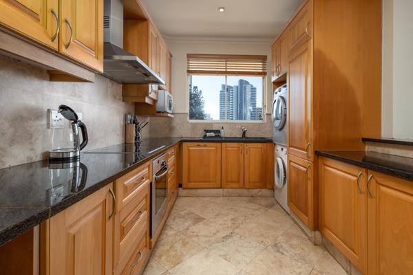 The kitchen is fully equipped for self-catering with a fridge-freezer, stove and oven, a microwave, dishwasher, washing machine, and a tumble-dryer. The lounge area contains a TV with selected DStv channels.