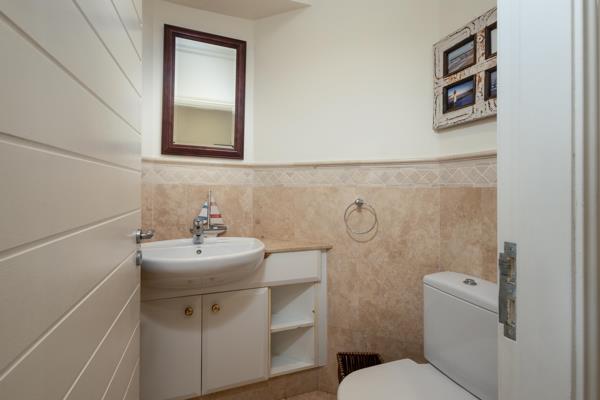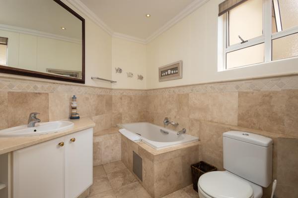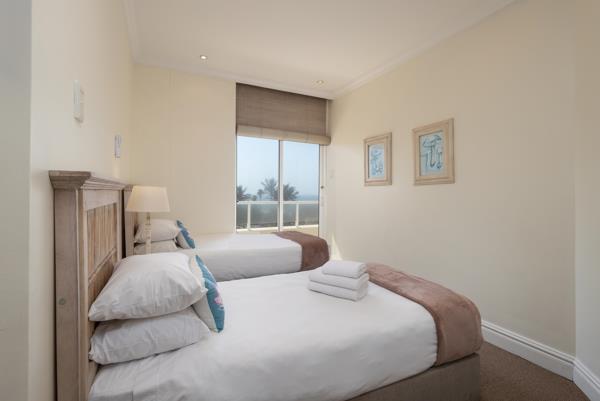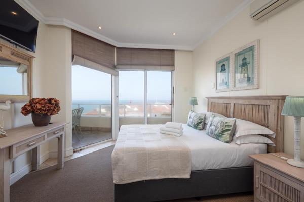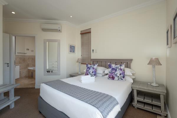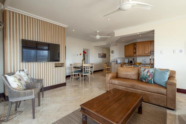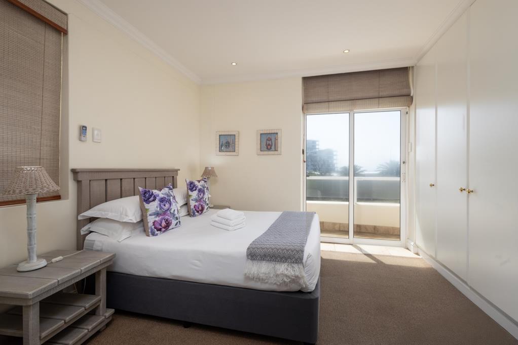 The kitchen is fully equipped for self-catering with a fridge-freezer, stove and oven, a microwave, and a washing machine, as well as a breakfast bar with stools. The dining area contains a round 4-seater dining table and chairs. The lounge area contains a Smart TV with selected DStv channels. High speed uncapped Wi-Fi is available. Large windows offer lovely sea views.