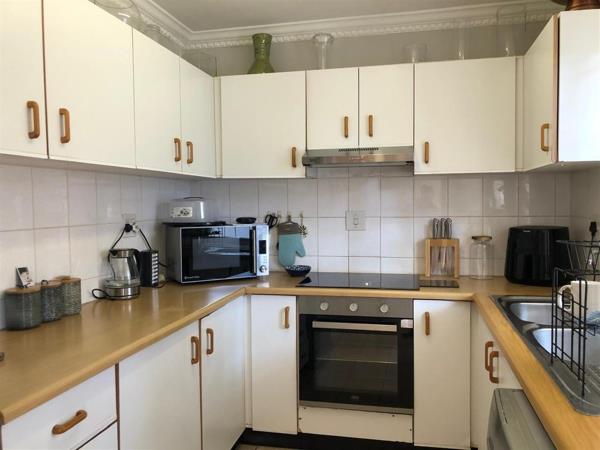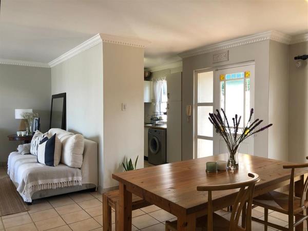 The open-plan layout is both modern and functional, with air conditioning in the lounge and main bedroom for year-round comfort. The living area flows seamlessly out to a private garden, ideal for small pets, and offers lovely views of the complex pool and even a glimpse of the sea.