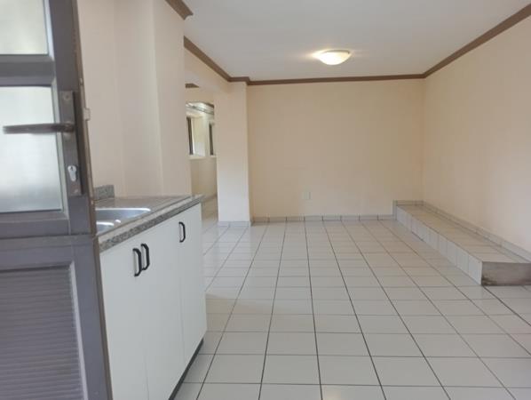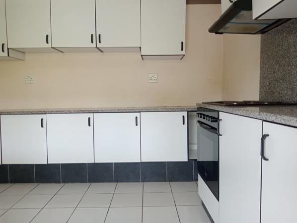 The open-plan kitchen flows seamlessly into the living and dining area and features ample built-in cupboards, as well as a stove and oven. The apartment is tiled throughout for easy maintenance.