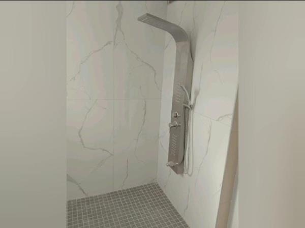 Fully tiled unit kitchen and bathroom Bathroom has a shower