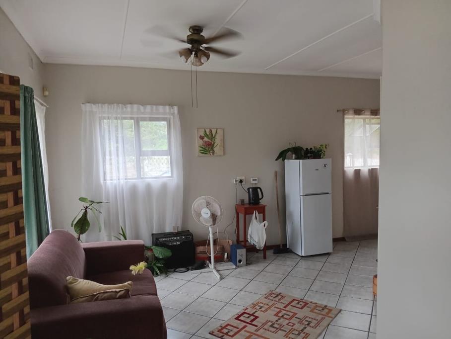 The spacious lounge area is bathed in natural light, thanks to a large window that offers a pleasant view of a garden and a swimming pool, creating a serene backdrop for relaxation. Built-in shelving provides convenient storage solutions, enhancing the functionality of the living space. This compact 1-bedroom property is ideal for a single professional or a couple seeking a low-maintenance, lock-up-and-go lifestyle in Richards Bay.