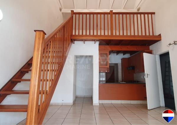 The apartment boasts a spacious lounge area, ideal for relaxation and entertaining. A distinctive wooden staircase leads to a versatile loft space, adding character and potential for a home office or additional living area. Throughout the main living areas, light-colored tiled flooring ensures a clean and contemporary feel, while one room benefits from warm wooden plank flooring. Air conditioning is installed for year-round comfort.