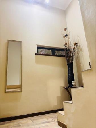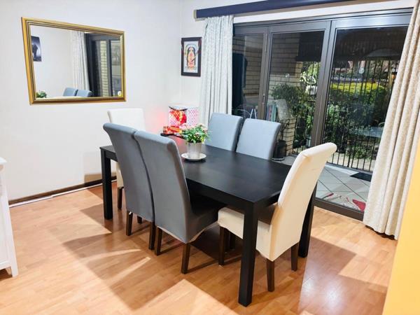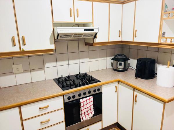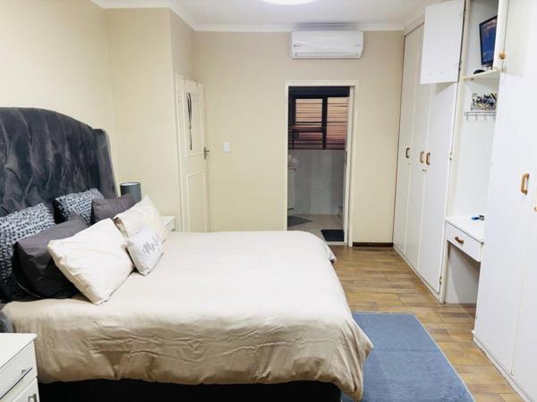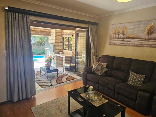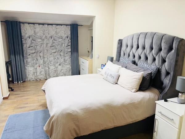 The spacious main bedroom includes an en suite bathroom, built-in carpets, air conditioning, and tasteful curtains. Two additional bedrooms and a second full bathroom provide ample space for family or guests. The kitchen is neat and well-equipped with a modern glass-top stove and a separate scullery. The open-plan lounge and dining area flow into a fully enclosed entertainment space, perfect for relaxing or hosting guests.