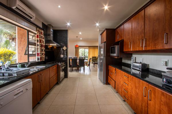 The home boasts 2 kitchens. Each kitchen is well-equipped with a gas stove, oven, microwave, kettle, toaster, fridge-freezer, and dishwasher. The living area has a 10-seater dining table, and the lounge has comfortable couches and a TV with DStv channels and Wi-Fi. Hidden under the staircase is a children''s corner with books and toys to keep children occupied during rainy days.