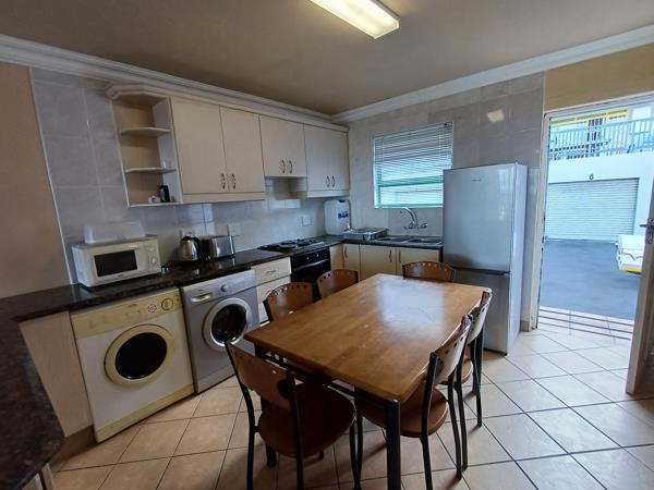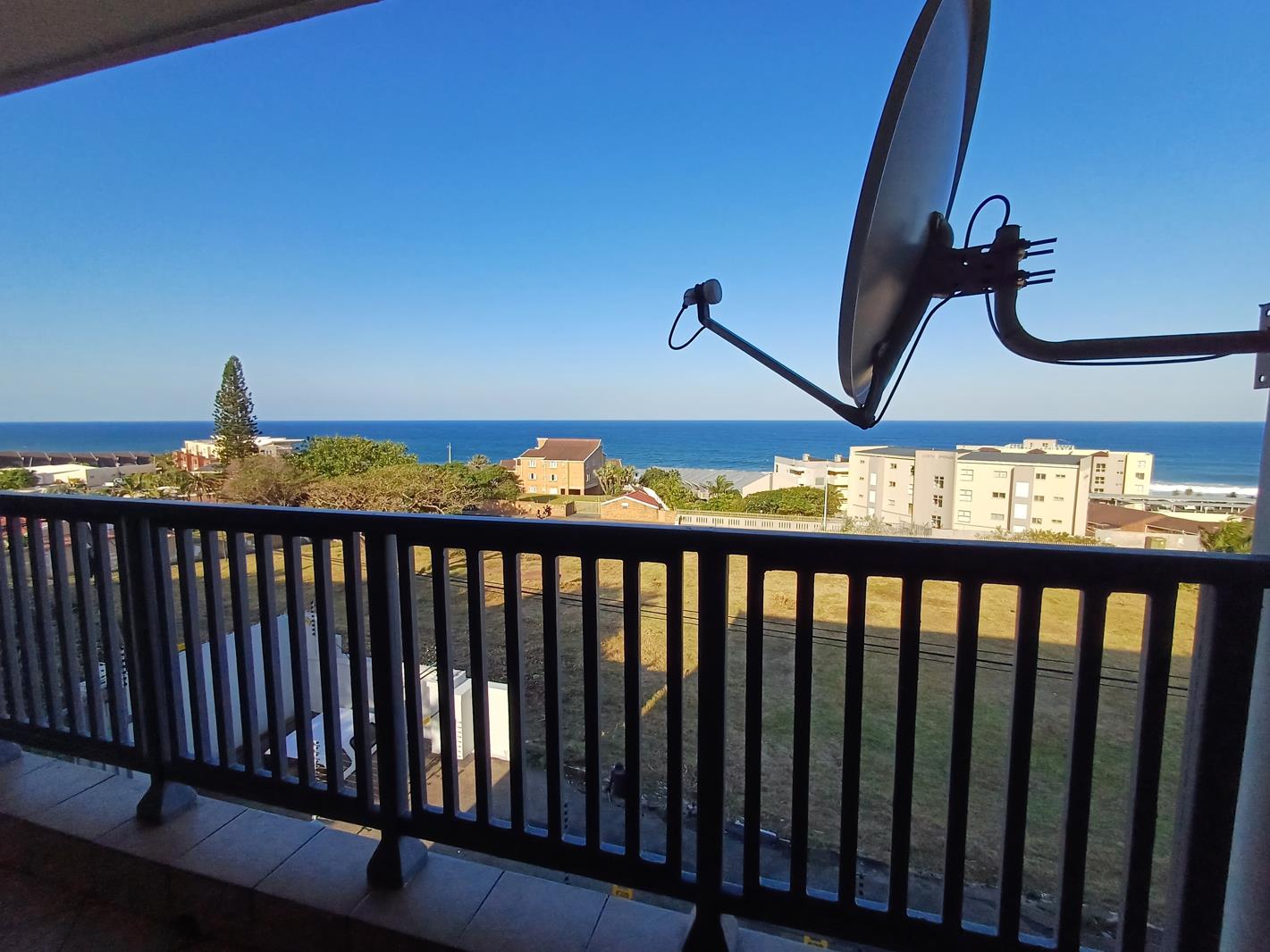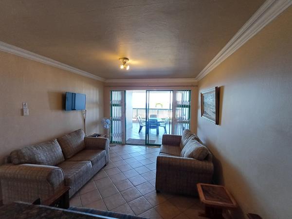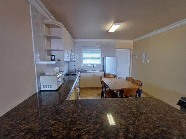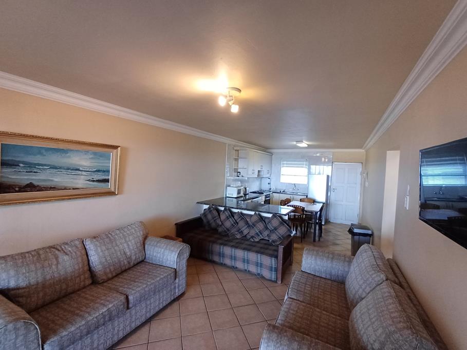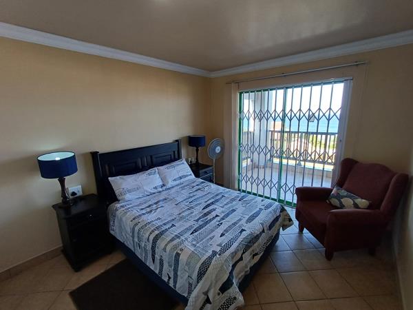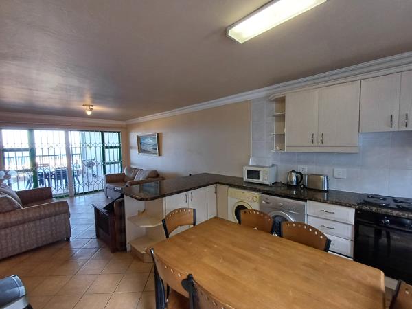 The kitchen is well-equipped for self-catering with a stove and oven, fridge-freezer, washing machine, tumble drier, microwave, kettle, and toaster. The lounge contains a TV with full DSTV . The living area opens through sliding doors to a sheltered balcony with sea views.