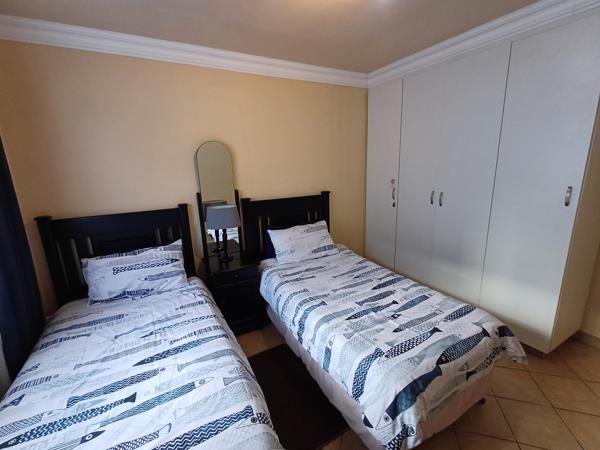 The apartment can accommodate up to 4 guests and comprises 2 bedrooms, 2 bathrooms, and an open-plan kitchen and living area. The first bedroom contains a double bed with an en suite shower This room has a sliding door opening to the balcony with a Weber braai. The second bedroom contains 2 single beds.