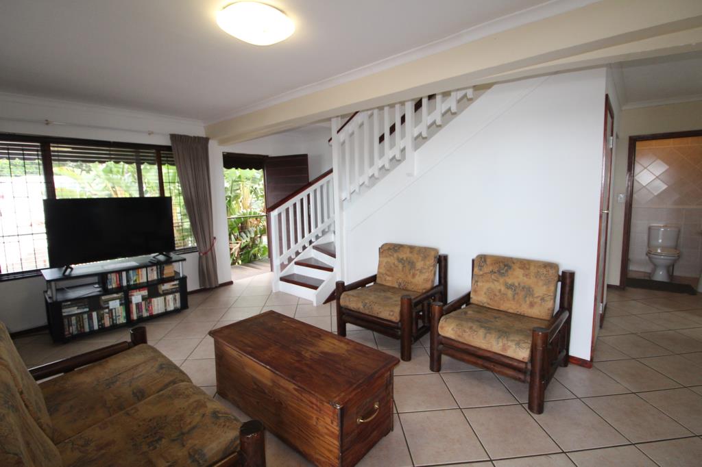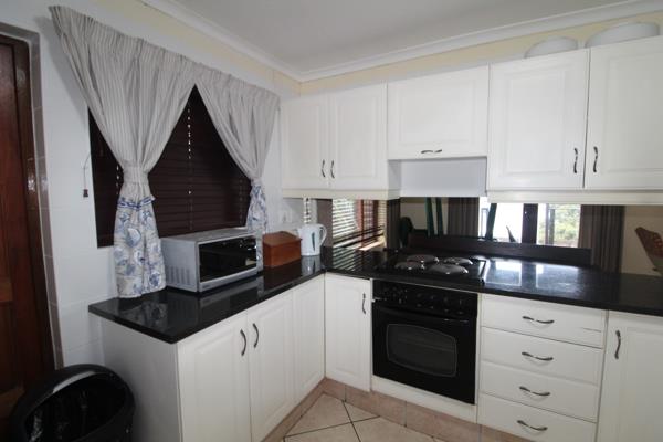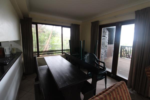 The cabin opens to a covered balcony deck with built-in braai facilities. On the lower level is a second deck with a splash pool. Double garage parking is provided.