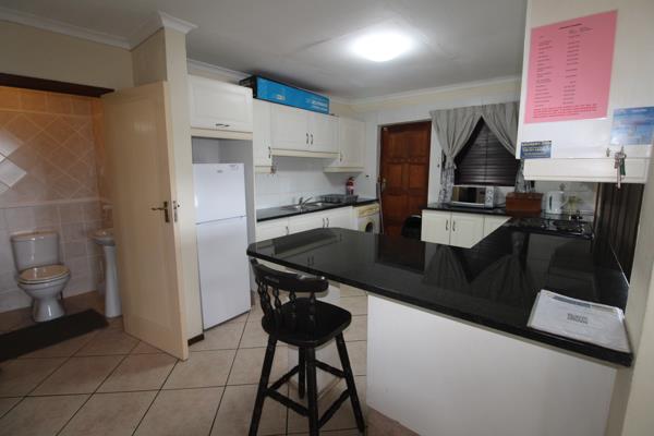 The kitchen is well-equipped for self-catering with a stove and oven, microwave, kettle, toaster, and washing machine. The dining area contains an 8-seater dining table and benches. The lounge contains a flat-screen TV.