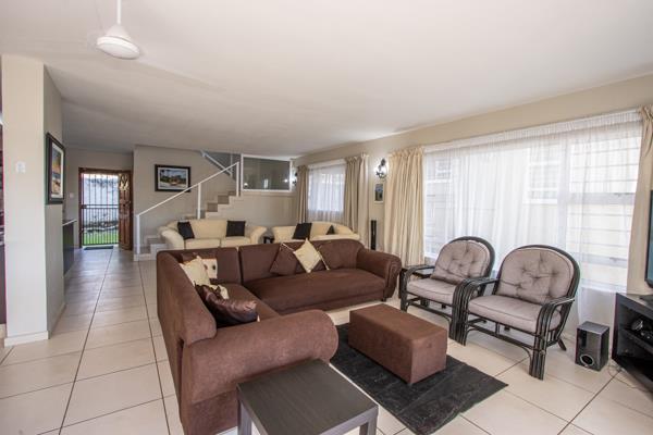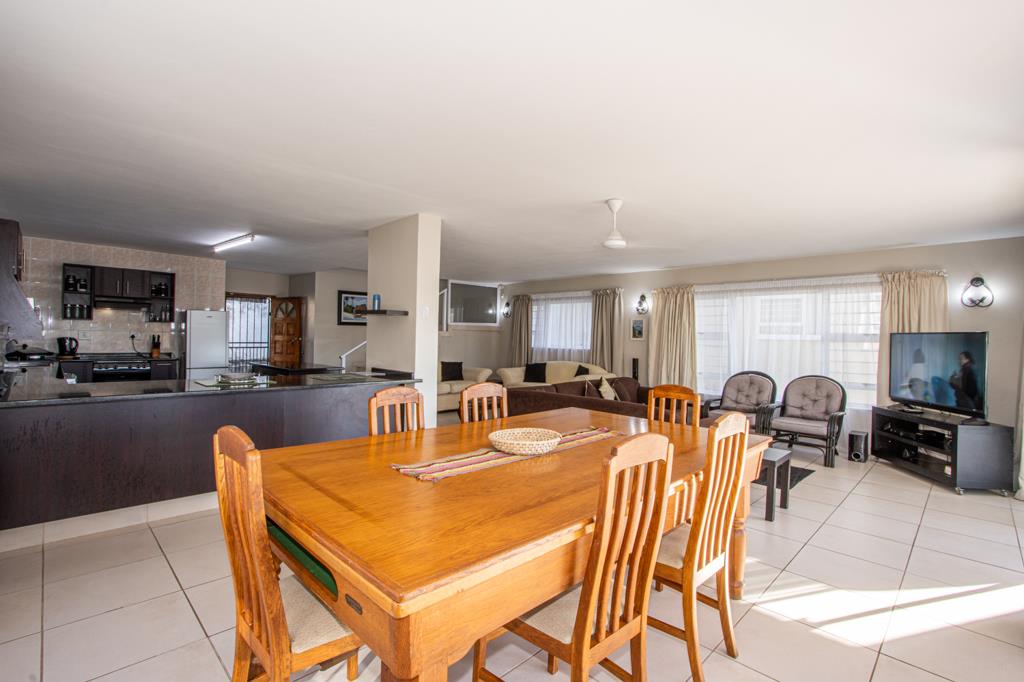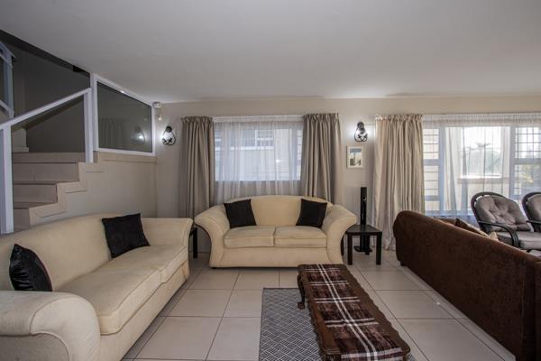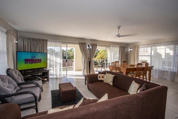 The kitchen, dining and living area, and guest toilet are downstairs. The kitchen is fully equipped for self-catering with a fridge-freezer, stove and oven, a dishwasher, and a front-loader washing machine. The dining area contains an 8-seater dining table and chairs. The living area contains 2 separate comfortable lounge sets and a flat-screen TV with a DVD player. Guest needs to bring with their own standard Dstv decoder and card, and connection cables, if you want TV channels.