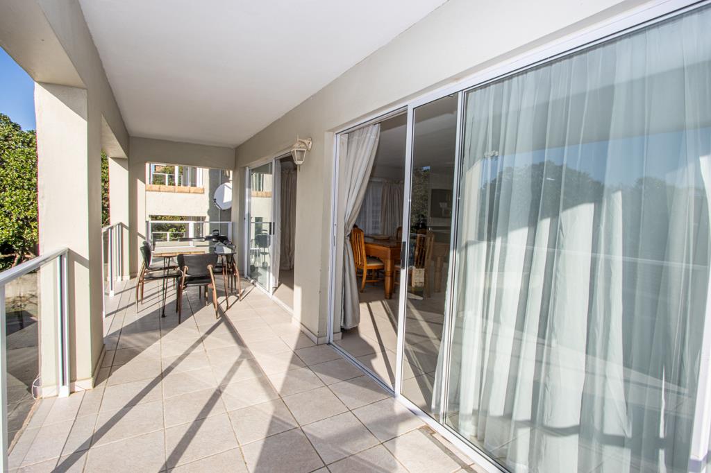 Sliding doors open to the first level balcony with outdoor dining furniture and a kettle braai facility.