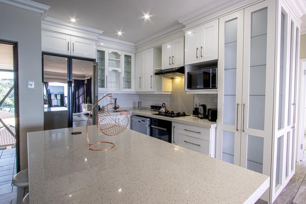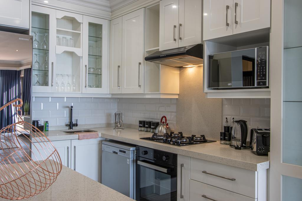 The unit features a well-equipped kitchen that includes a gas stove, oven, microwave, kettle, toaster, cutlery, crockery, fridge-freezer, dishwasher, and a breakfast bar with stools. The adjacent lounge has comfortable couches for guests to relax and features a TV with DStv channels.