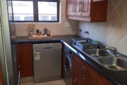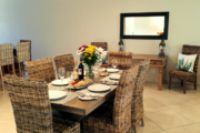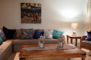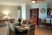 The apartment also comprises a kitchen, lounge and dining area. The kitchen is fully equipped for self-catering and contains a stove, oven, fridge-freezer, microwave, and cutlery and crockery. There is also a breakfast bar with stools. A dishwasher, a washing machine and a tumble-dryer are available for your convenience. The dining area has seating space for 6 people, while the lounge has a comfy couch and a TV with a full selection of DStv channels.