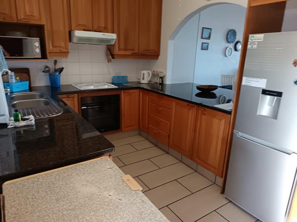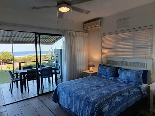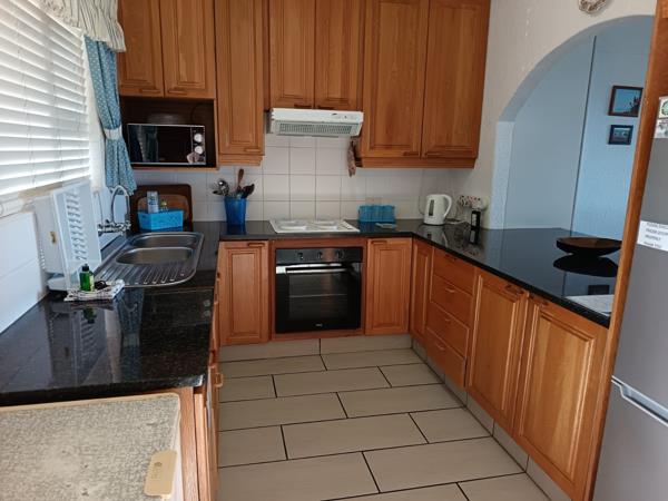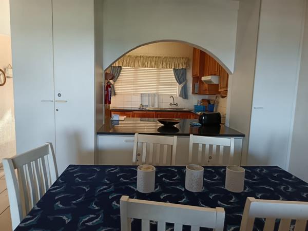 The kitchen is well-equipped for self-catering with a fridge-freezer, stove and oven, microwave, kettle, and cutlery and crockery. The dining area contains a 6-seater dining table and chairs, and a ceiling fan. The lounge has comfortable seating and a ceiling fan. There is a flat screen TV with Easy view bouquet Bring your own decoder for additional bouquets. The living area opens to a large covered patio with outdoor furniture and sea views. Secure parking is available on-site.
