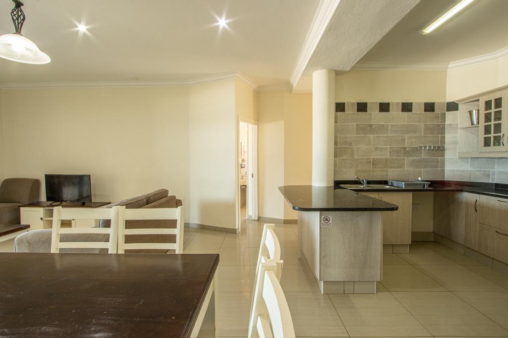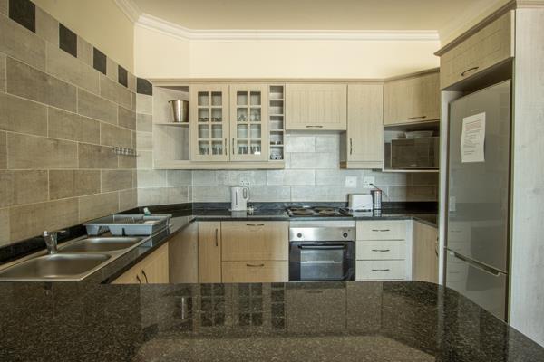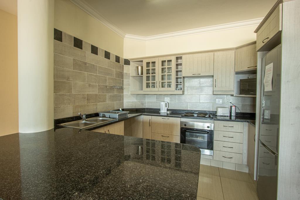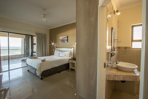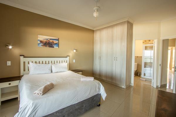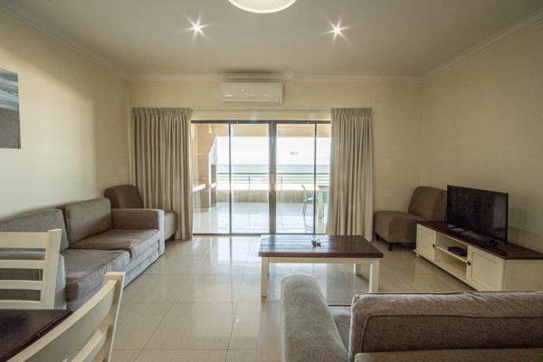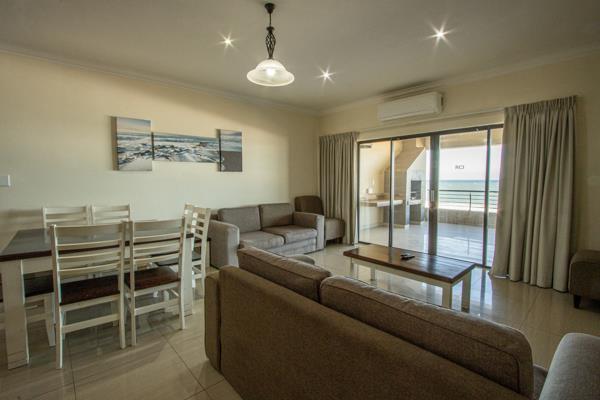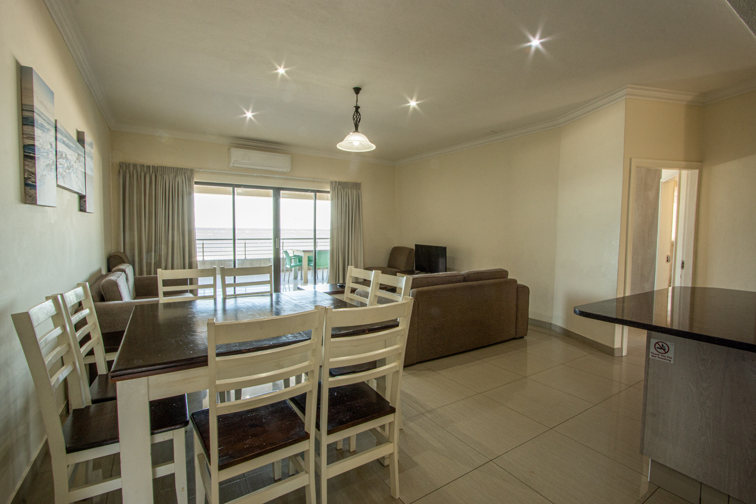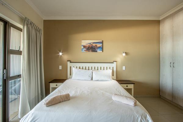 The kitchen is fully equipped with everything needed for self-catering, allowing guests to prepare their own meals. The living area features pre-paid air-conditioning and a TV with selected DStv channels for entertainment. The lounge and main bedroom both lead out to a spacious balcony, which offers a beautiful view of the sea and includes built-in braai facilities for outdoor cooking.
