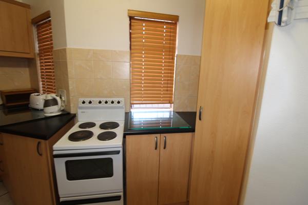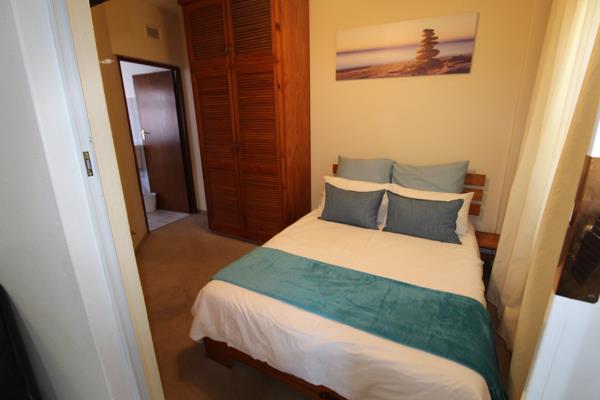 Through the sliding door is a patio with a table and chairs and a built-in braai. This patio also boasts a view of the sea and leafy surroundings. Guests also have access to a communal swimming pool and secure parking is available.