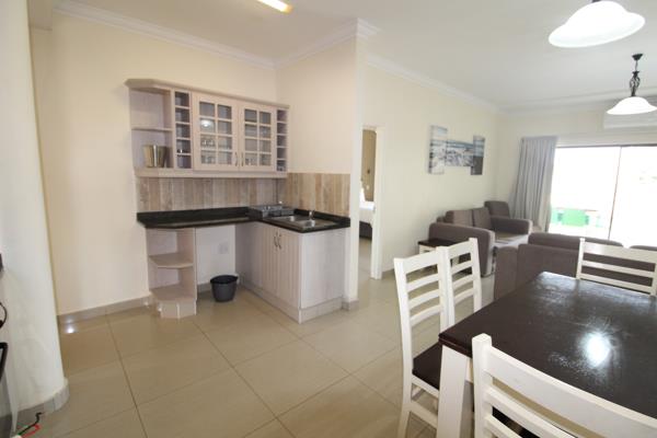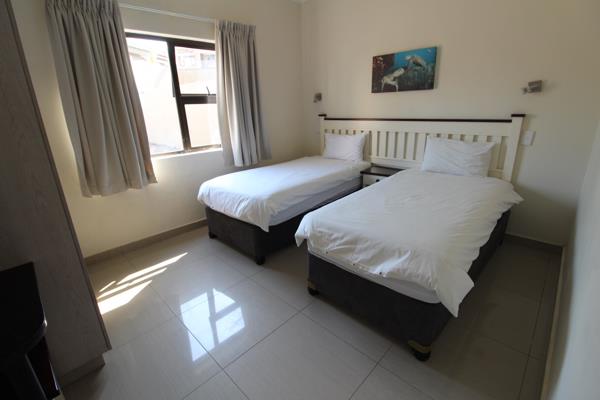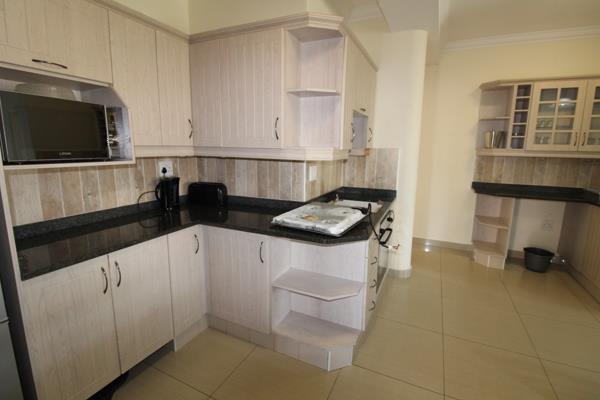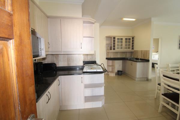 The kitchen is fully equipped for self-catering. The lounge area features pre-paid air-conditioning, and a TV with selected DStv channels. The lounge and main bedroom lead out to the large balcony with built-in braai facilities.