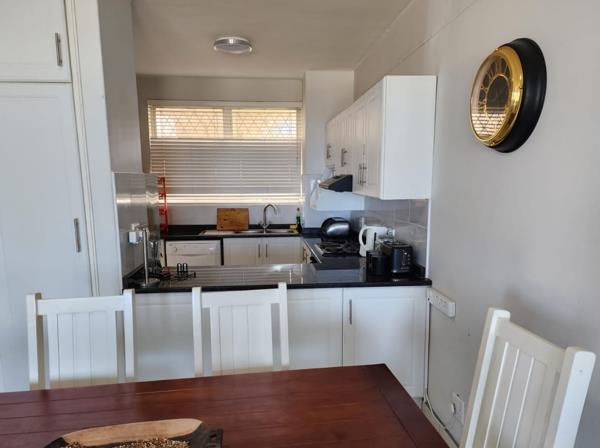 The kitchen is equipped with a fridge-freezer, stove, oven, microwave, basic cutlery, crockery, and tea- and coffee-making facilities. There is also a dishwasher for guests convenience. It expands to the dining area and further opens to the lounge furnished with comfy couches and a TV with DStv.