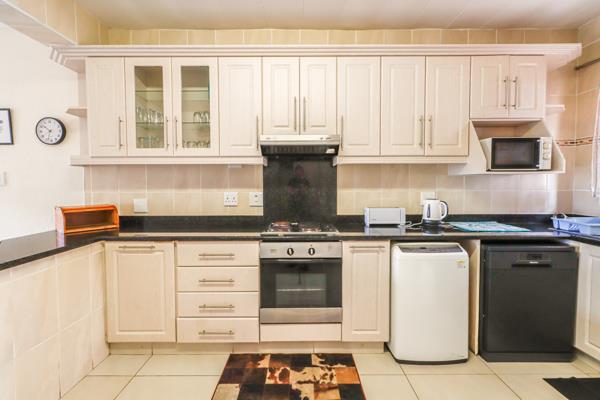 The kitchen is well-equipped for self-catering with a stove and oven, fridge-freezer, microwave, kettle and toaster. The dining area contains a 6-seater dining table and chairs. The lounge contains flat-screen TV and opens to a balcony.with braai facility