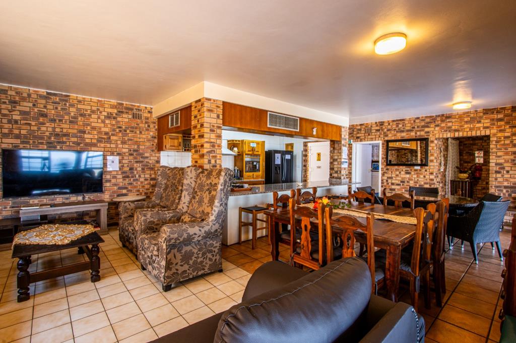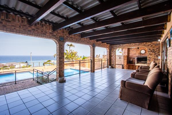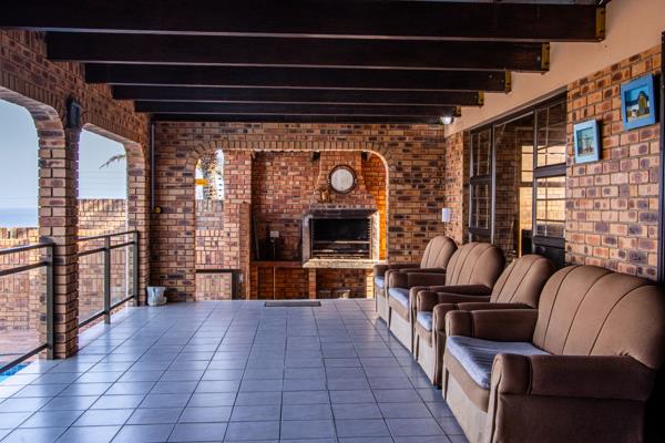 The living area opens onto a covered patio with outdoor seating and a built-in braai, perfect for enjoying sea views. The patio leads to a fenced swimming pool, ideal for cooling off on hot summer days. Guests have access to the garage and off-street parking. The property is equipped with solar power and an inverter for power outages, along with an alarm system, security cameras, and electric fencing for added security